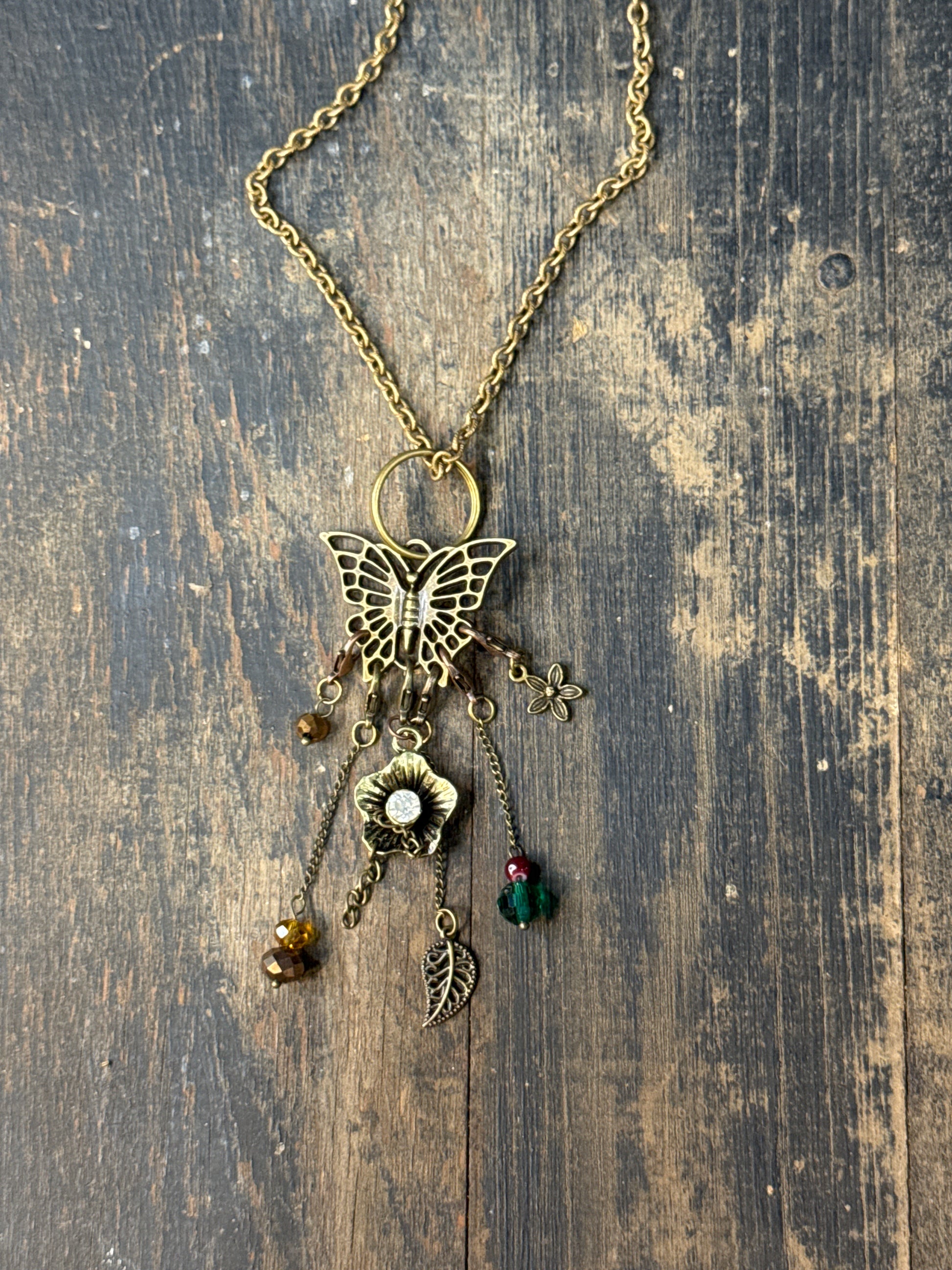 Antique Gold Necklace with butterfly pendant; 6 removable lobster claw stitch markers; bronze drop, chain copper drop, Diamond flower, leaf, emerald, flower